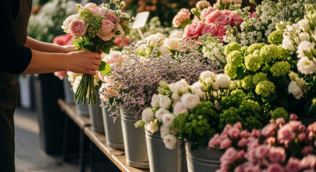 Primrose Cottage will deliver a rental stand filled with pales of high quality flowers to your event. Your guests get to make a bouquet by selecting flowers they want.