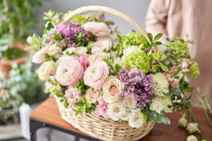 This French arrangement features a variety of pinks, creams and pops of purple. Lilac, ranunculus and roses bloom from this basket.