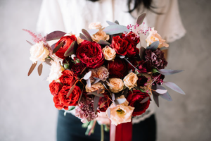 This hand tied bouquet is plum full of red garden flowers, burgundy mums and peach spray roses.