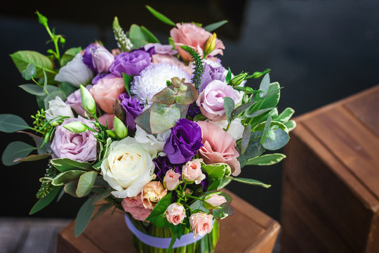 Feminine hand tied bouquet purple, white and peach flowers. Allow for at least 7 days notice.