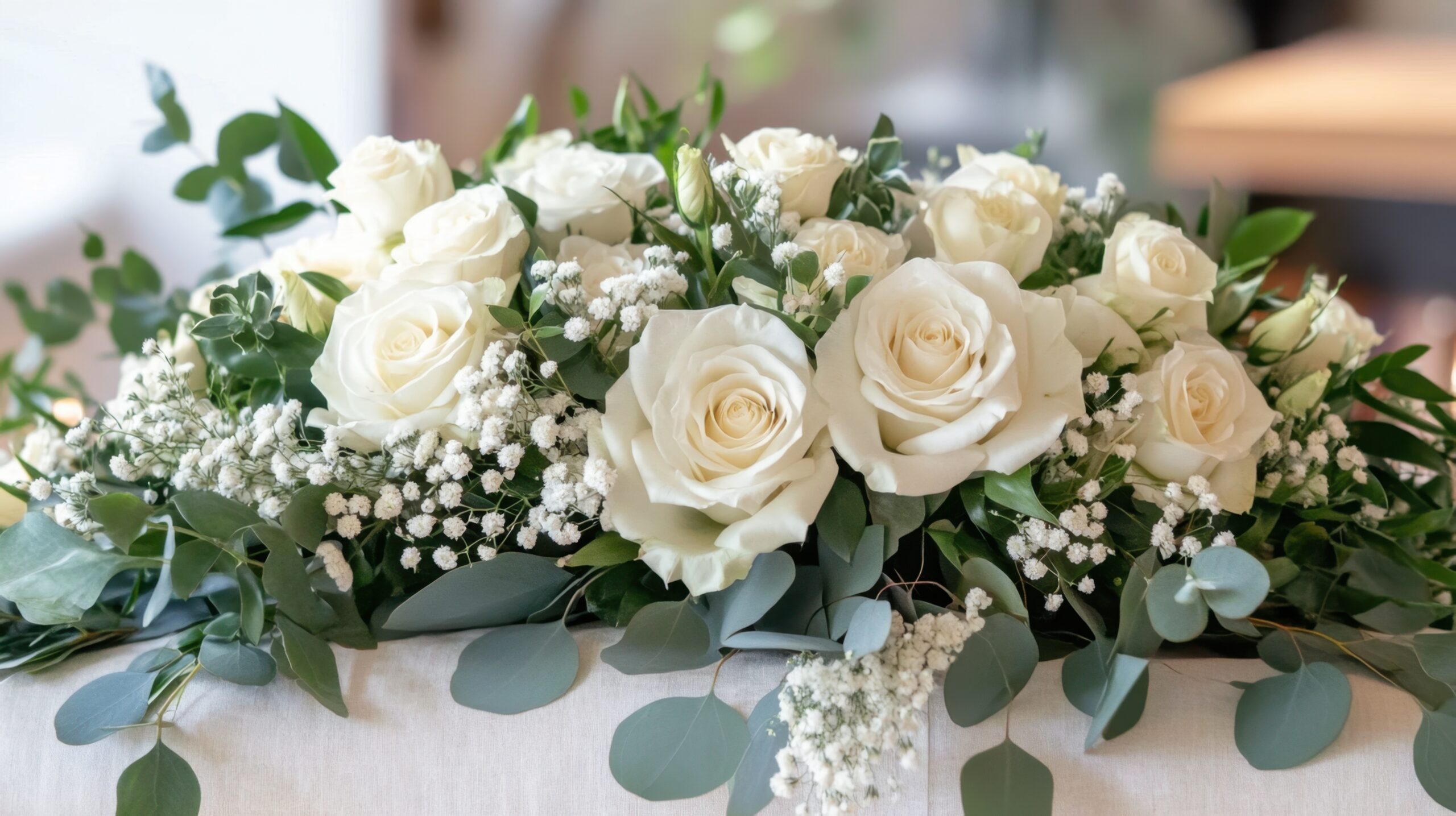 A lush casket spray featuring 17 pristine roses, delicate baby breath, and cascading eucalyptus leaves. Must order 7 days before ceremony.